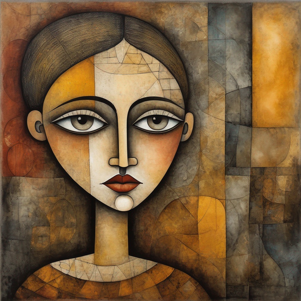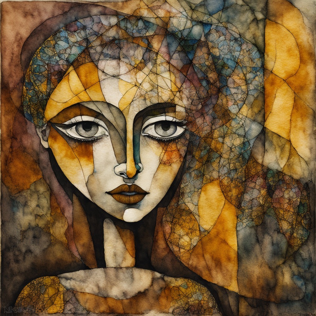 An artistic portrait of a woman with captivating eyes, wearing a headscarf and detailed earrings against a textured background.