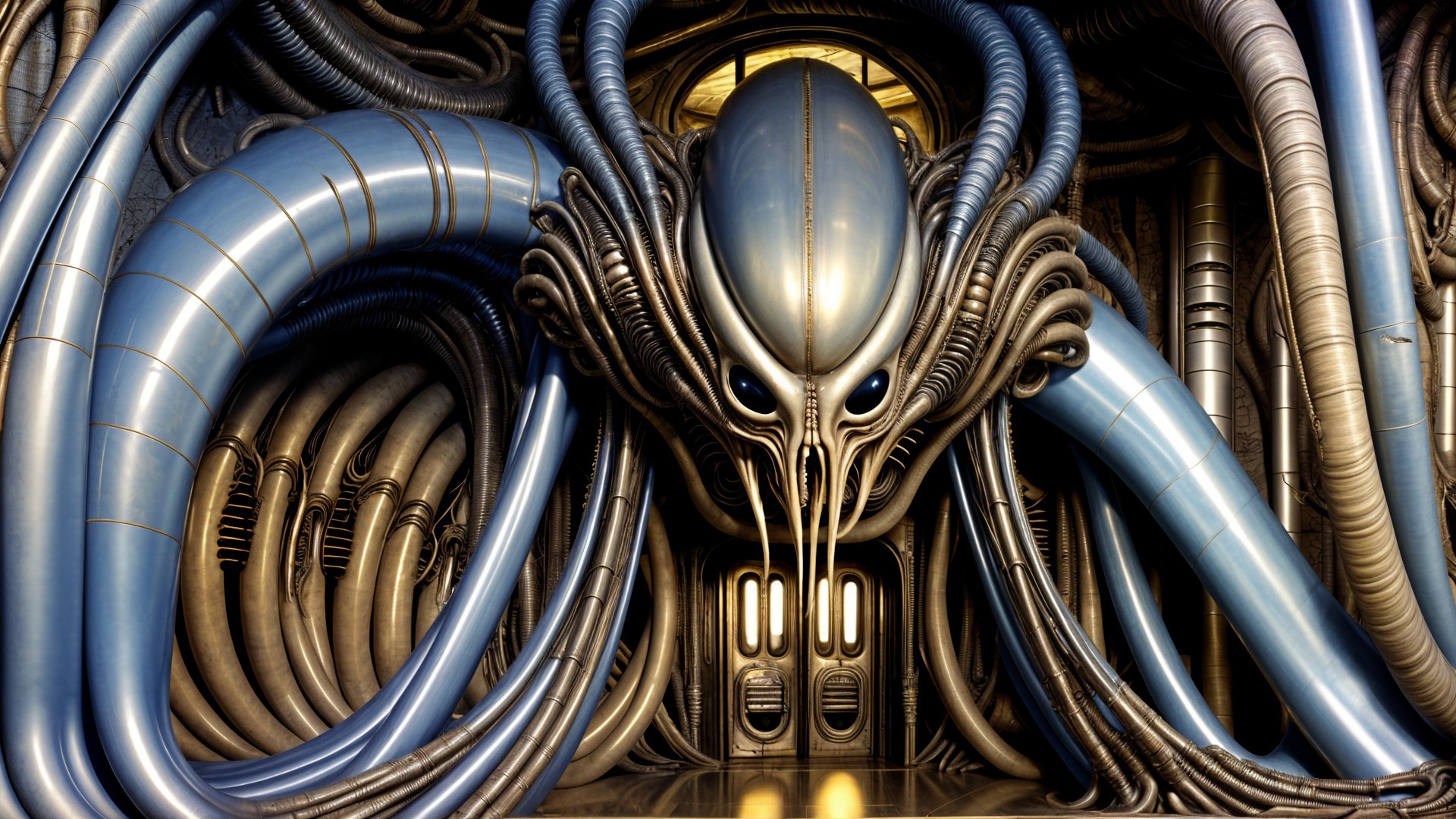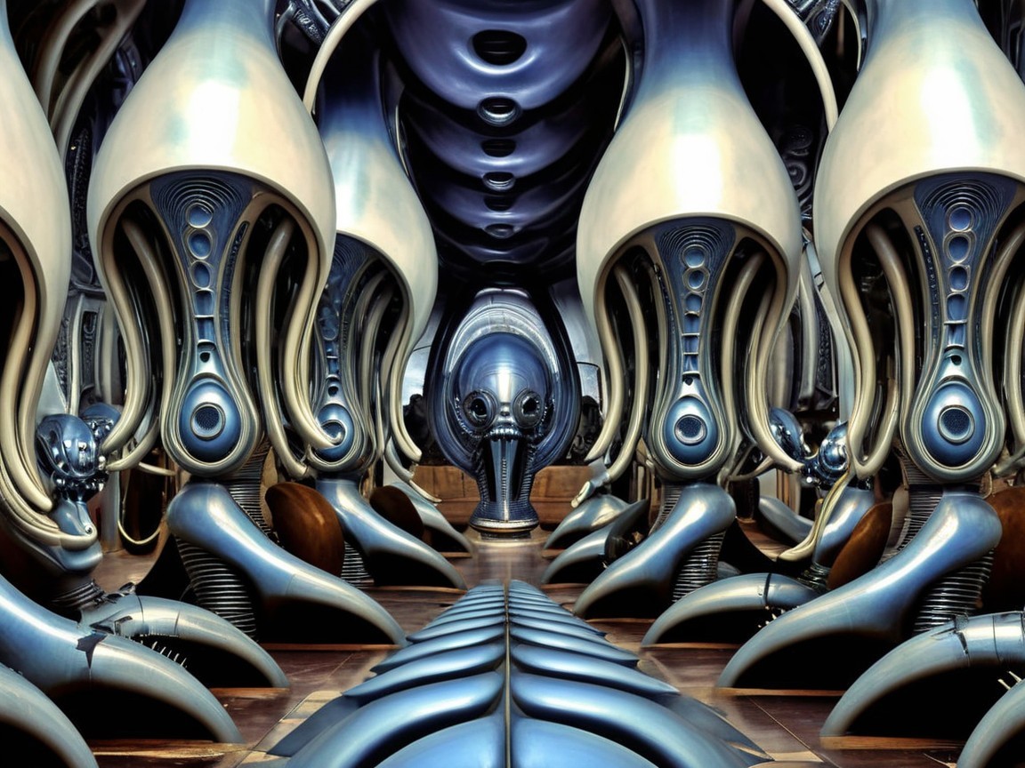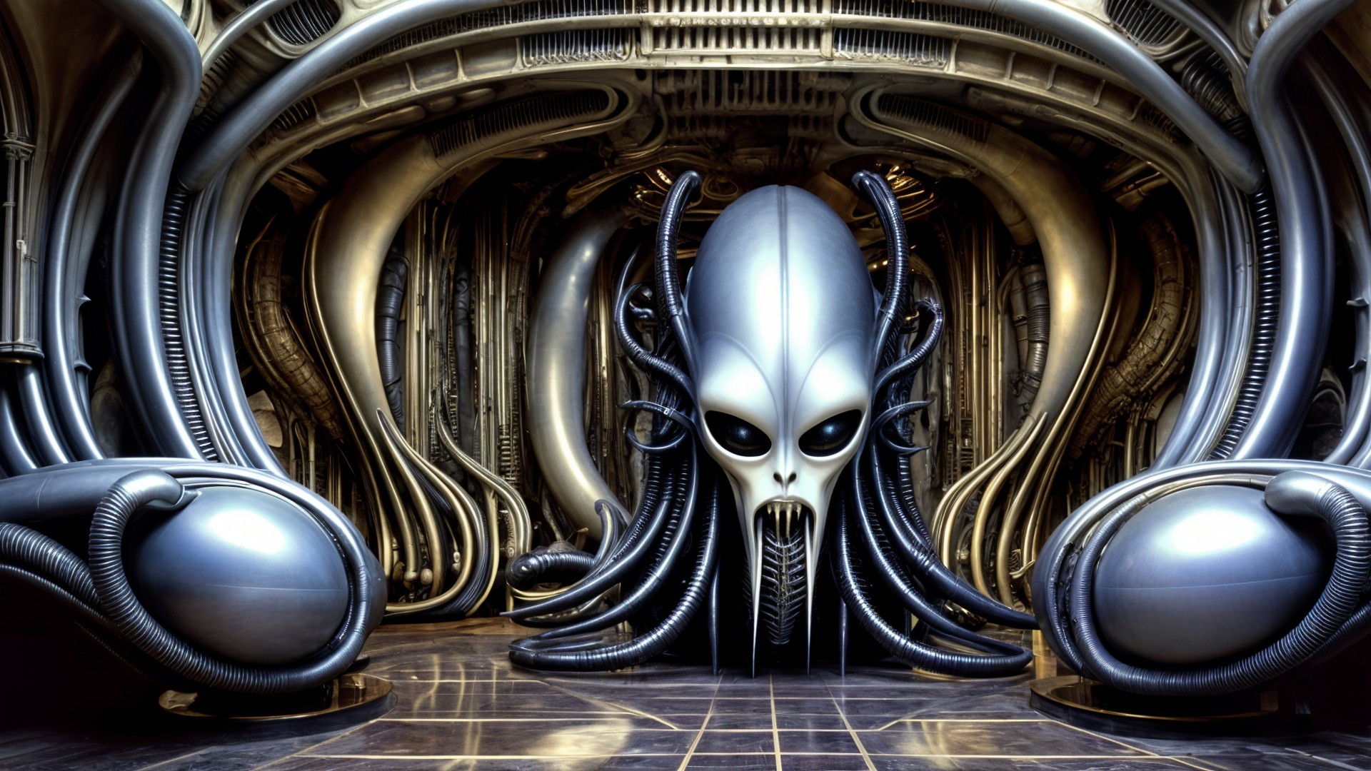 The image features two intricate, alien-like entities with smooth metallic surfaces and overlapping tentacle-like structures, set against a complex, futuristic backdrop.