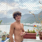 A muscular young man stands in a snowy landscape, surrounded by mountains. His confident pose contrasts with the surrounding wilderness, enhanced by a faint protective net in the background.