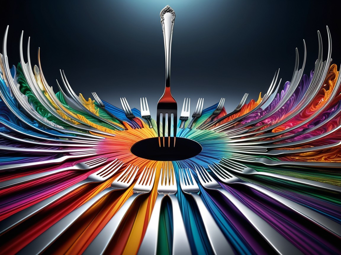 A vibrant arrangement of forks radiates outward from a central black hole, surrounded by colorful powders, creating a striking, artistic display of utensils and hues.