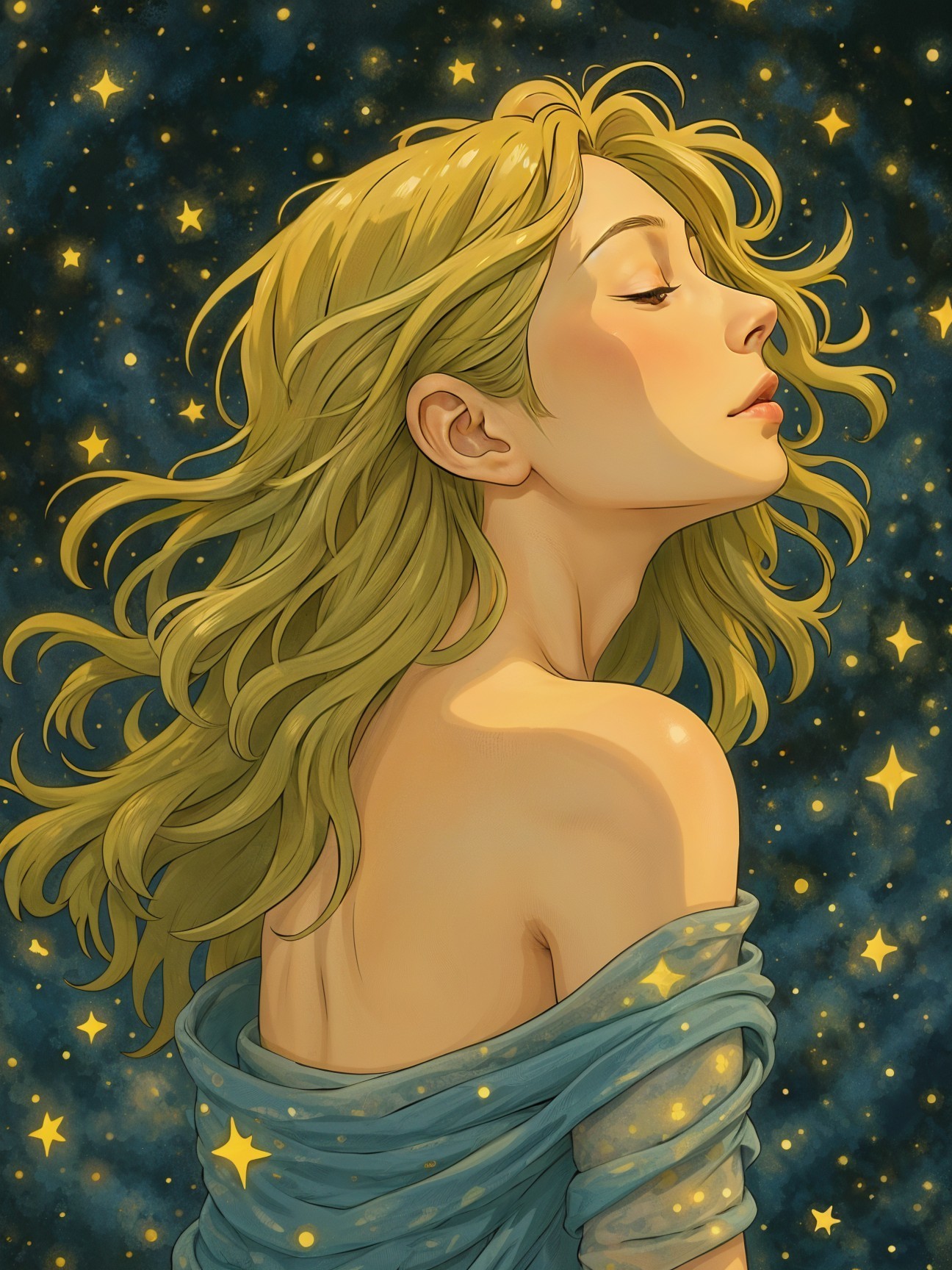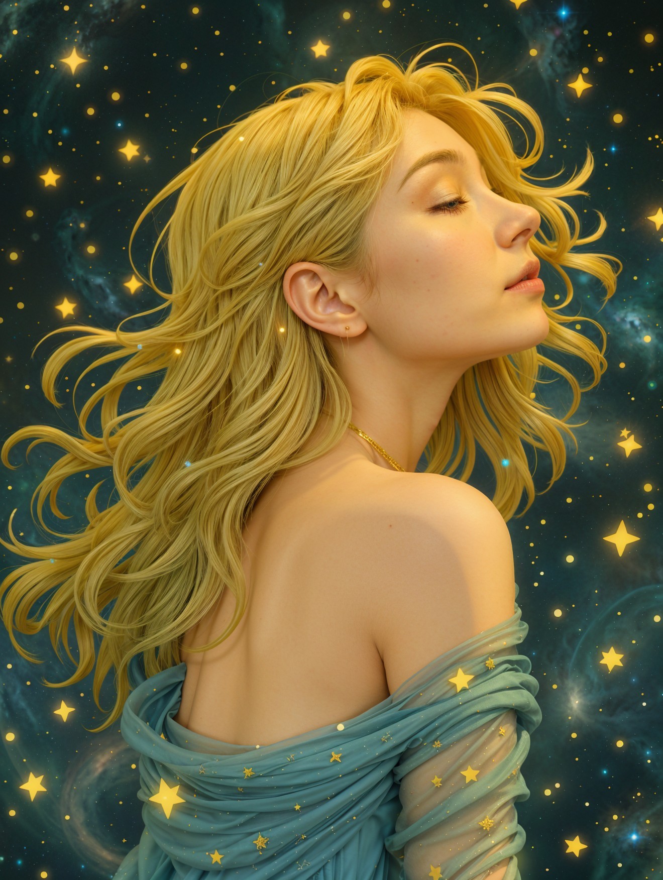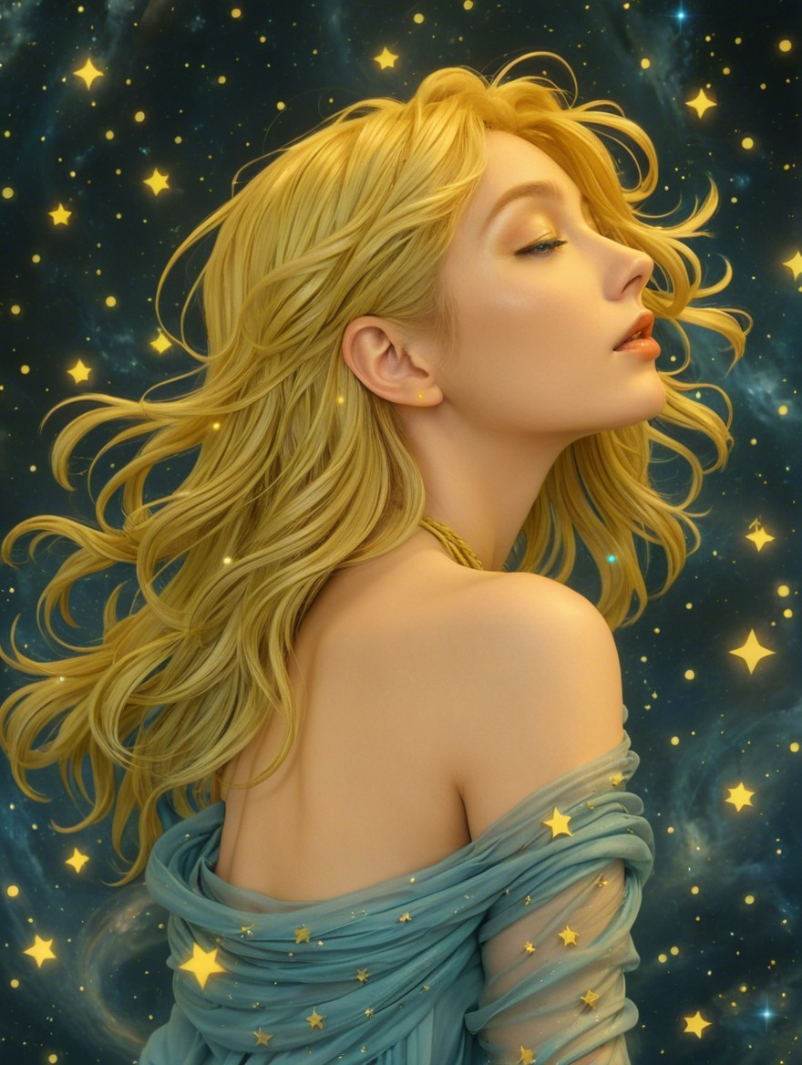 A serene profile of a woman with flowing blonde hair, set against a starry night sky. She wears a soft, flowing gown adorned with subtle stars, exuding a sense of tranquility and dreaminess.
