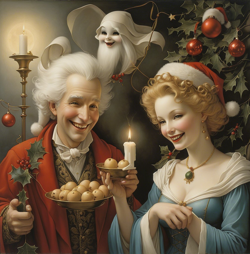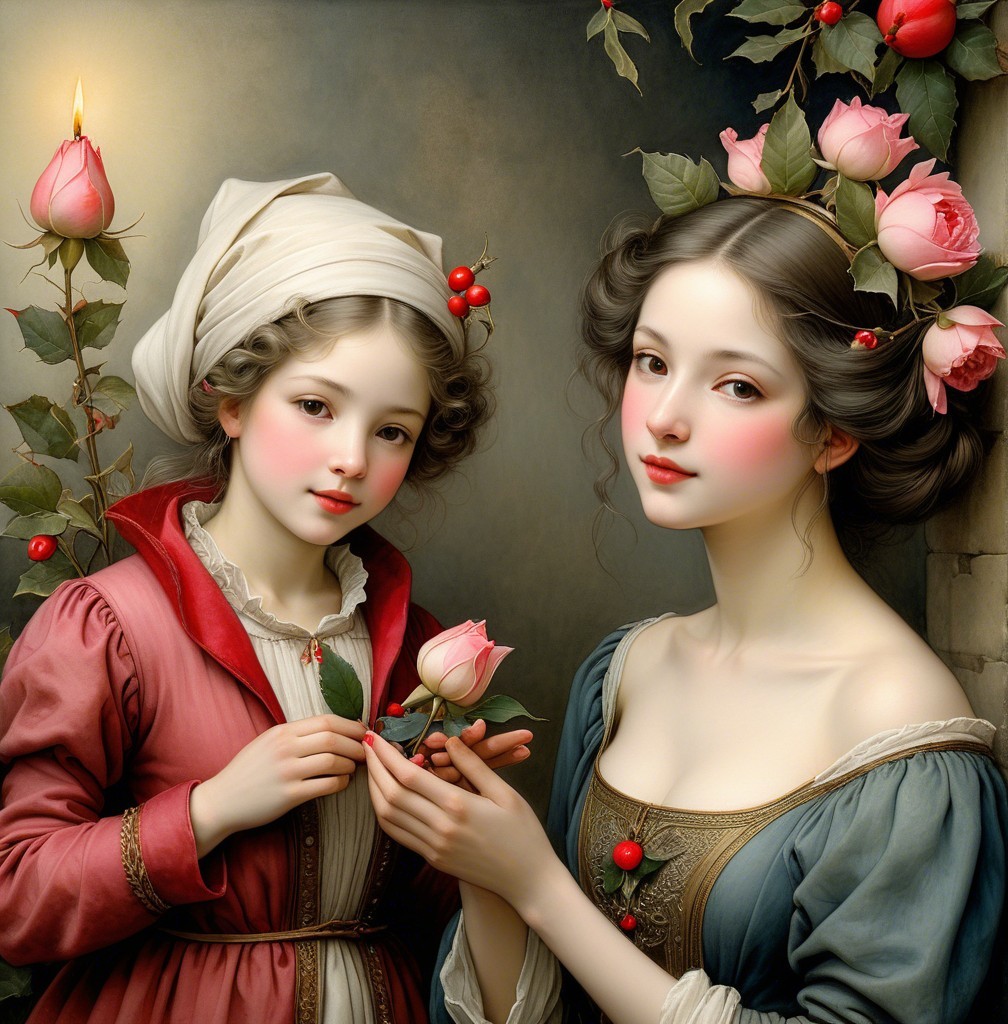 A serene young woman with long hair adorned with roses rests elegantly, holding a berry. She’s dressed in a blue garment, surrounded by flowers and fruit, exuding a whimsical, dreamy vibe.