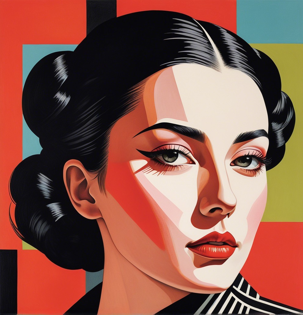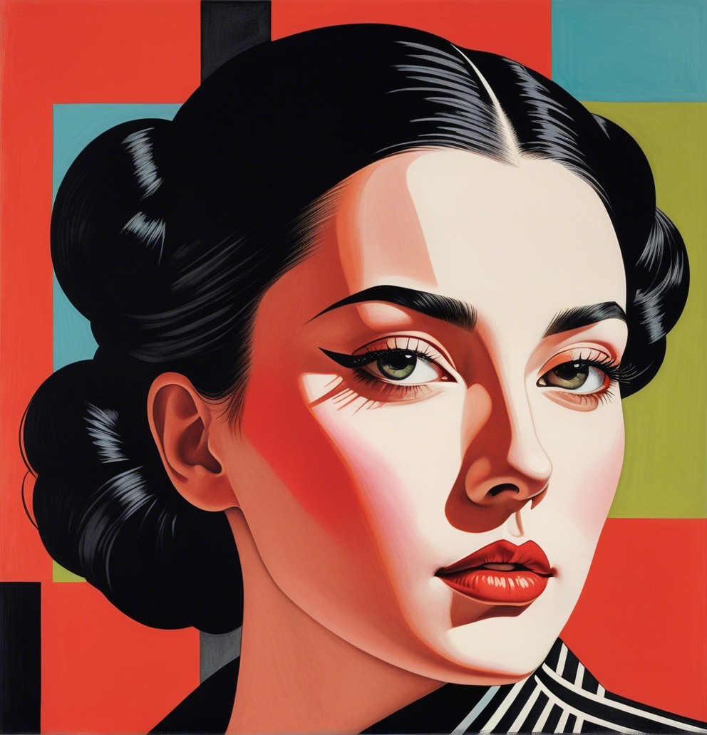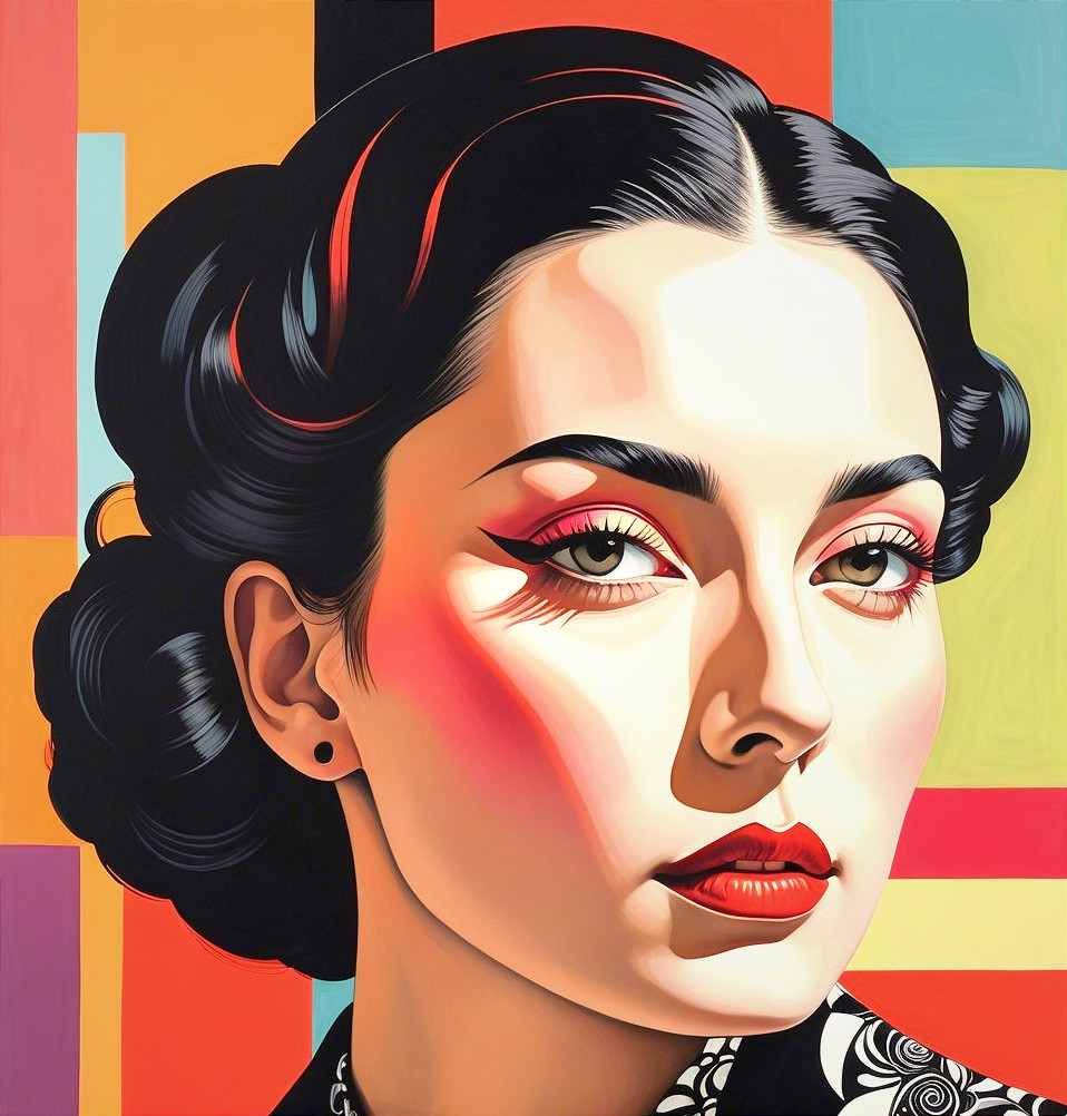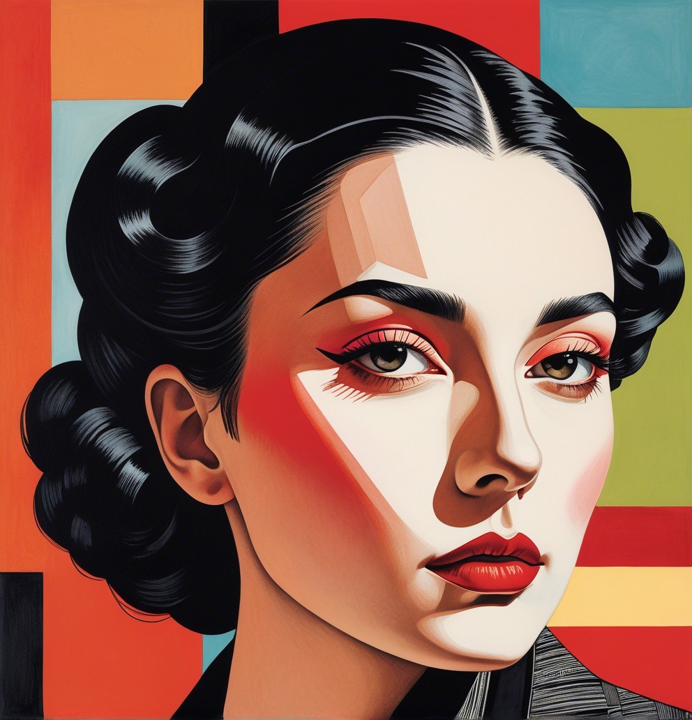 The artwork features a stylized portrait of a woman with striking features, bold makeup, and glossy black hair. Vibrant geometric backgrounds enhance the modern, artistic vibe.