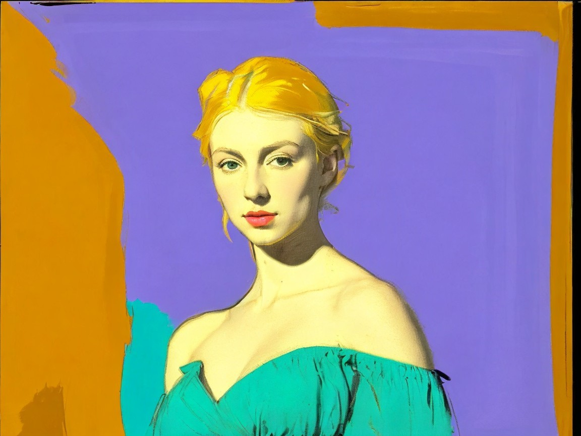 A realistic portrait of a woman art patron, with pulled-back blonde hair, wearing an off-shoulder green top, in front of an abstract painting in purple and orange and matching green.