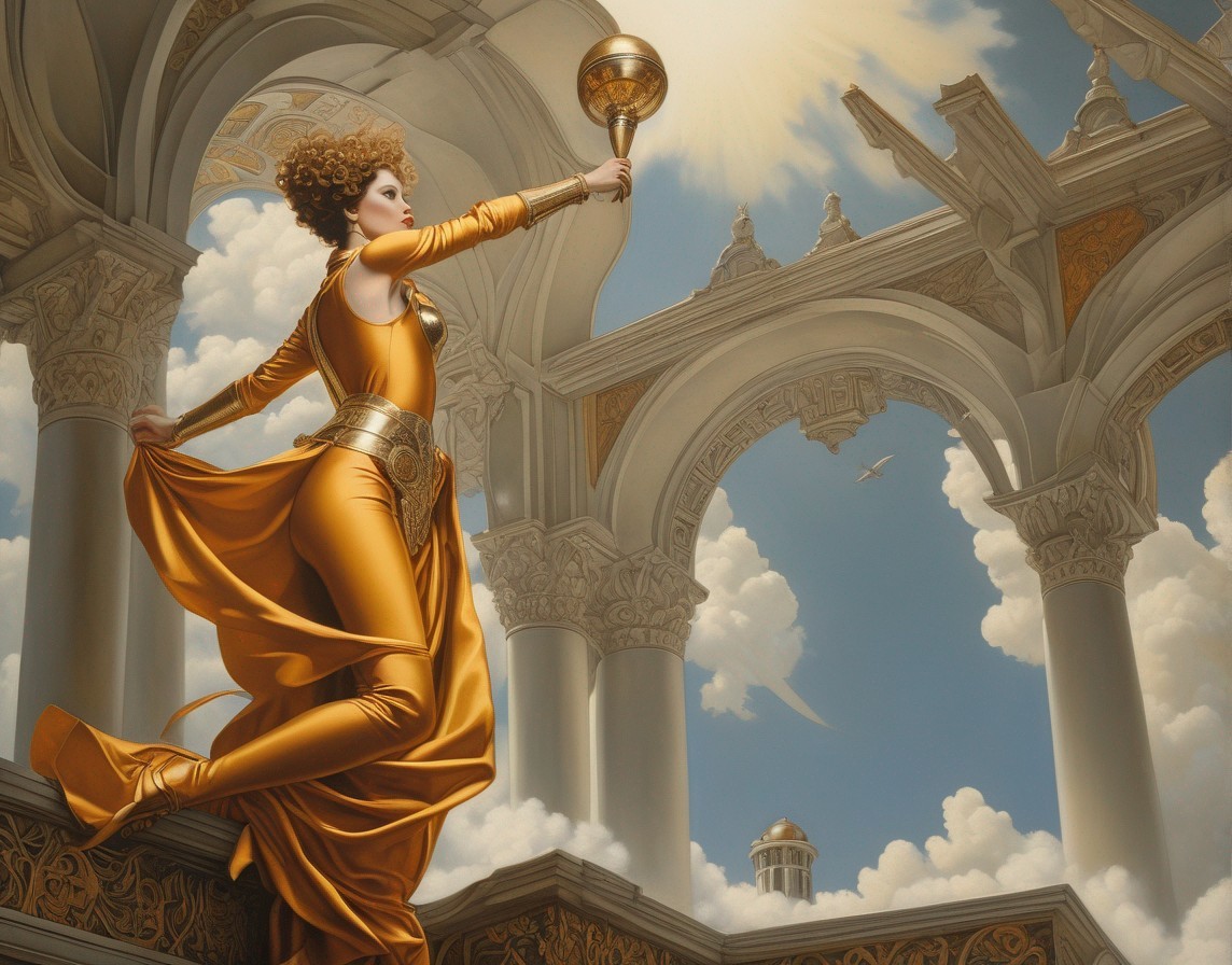 A regal woman with a crown and scepter poses before an arched window with clouds in the background, exuding elegance and authority.
