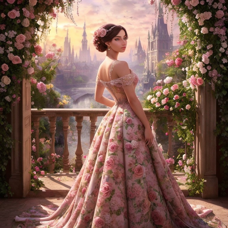 A lady in a rose-adorned gown stands on a balcony with a castle backdrop, surrounded by lush floral archways.