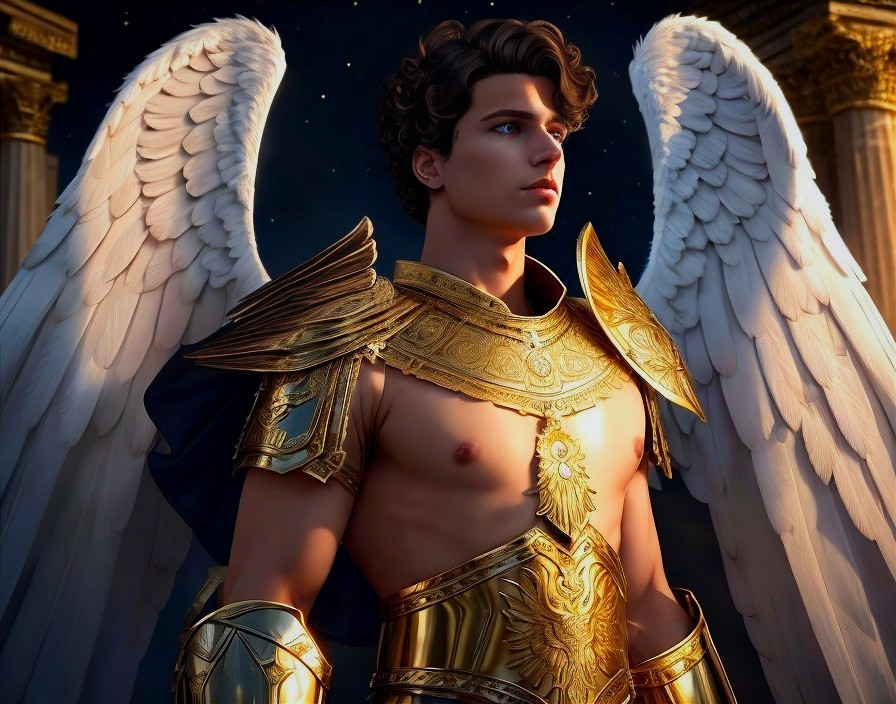 An angelic figure with golden armor and large white wings set against a cosmic backdrop and classical architecture.
