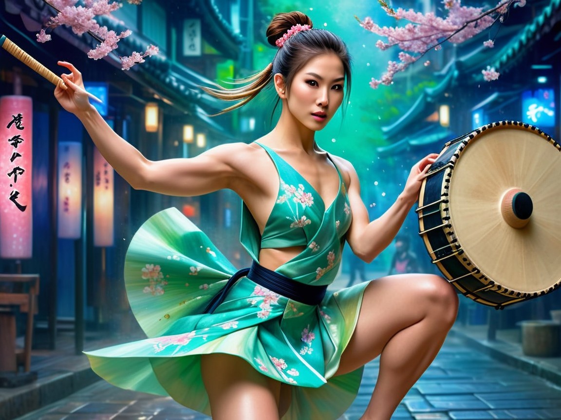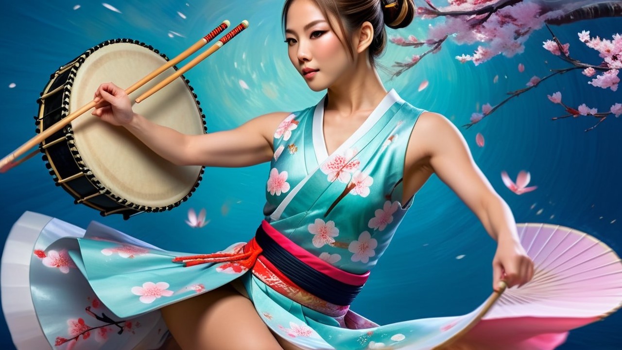 A graceful figure in a vibrant blue kimono adorned with cherry blossoms, striking a poised stance with a bow. The background features swirling patterns and pink petals, adding to the artistic vibe.