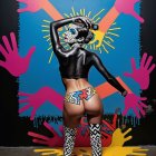 The image features a striking body-painted model striking a dynamic pose against a colorful abstract backdrop. The vibrant patterns and contrasting colors create an energetic visual impact.