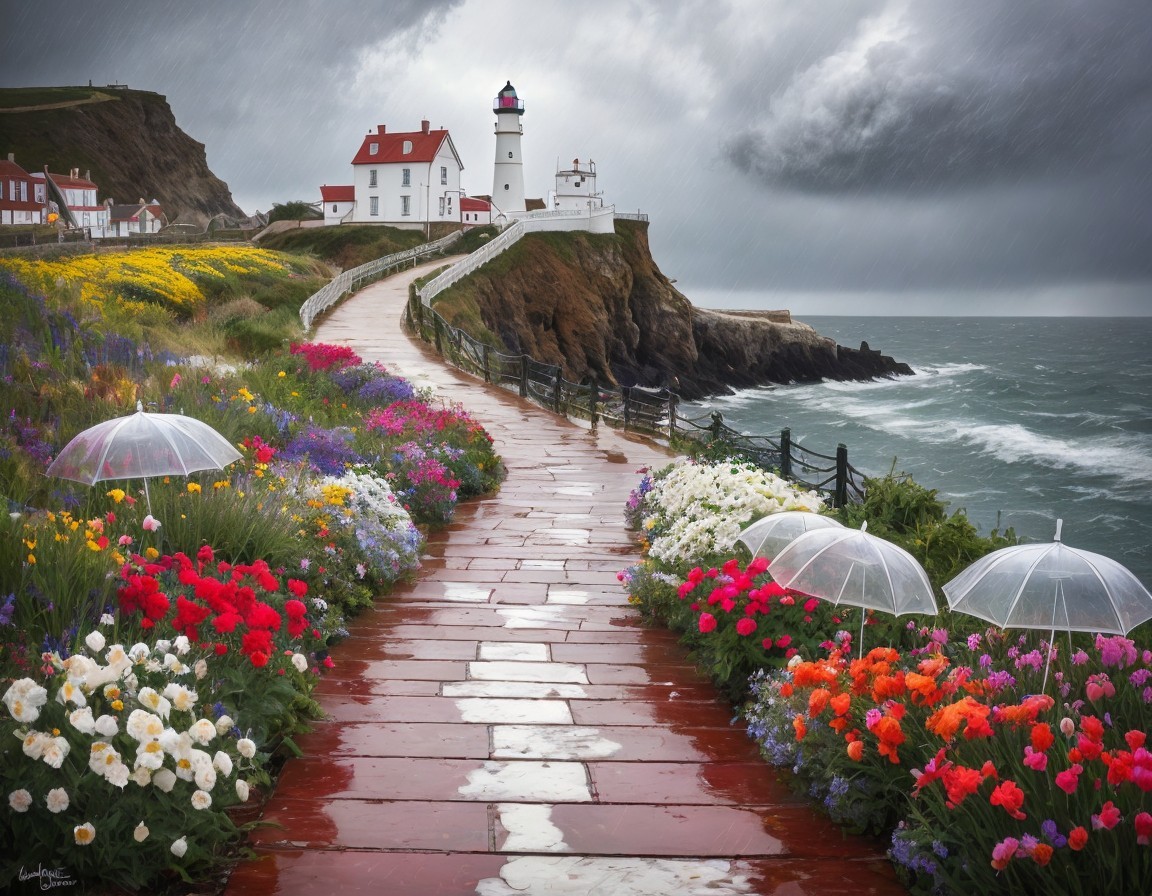 Prompt: Encaustic paint, dripping wet paint, Monet brush strokes Whimsical cobbled path leading to a red and white lighthouse, stormy weather over the seas, sea birds rocks flowers in pots, A struggling person holding an umbrella that is being blown around by the strong winds.