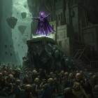 A dark, dramatic scene features a sinister figure in a purple cloak standing triumphantly on a rocky pedestal. Below, a crowd of shadowy figures reacts in horror and awe amidst a gloomy landscape.