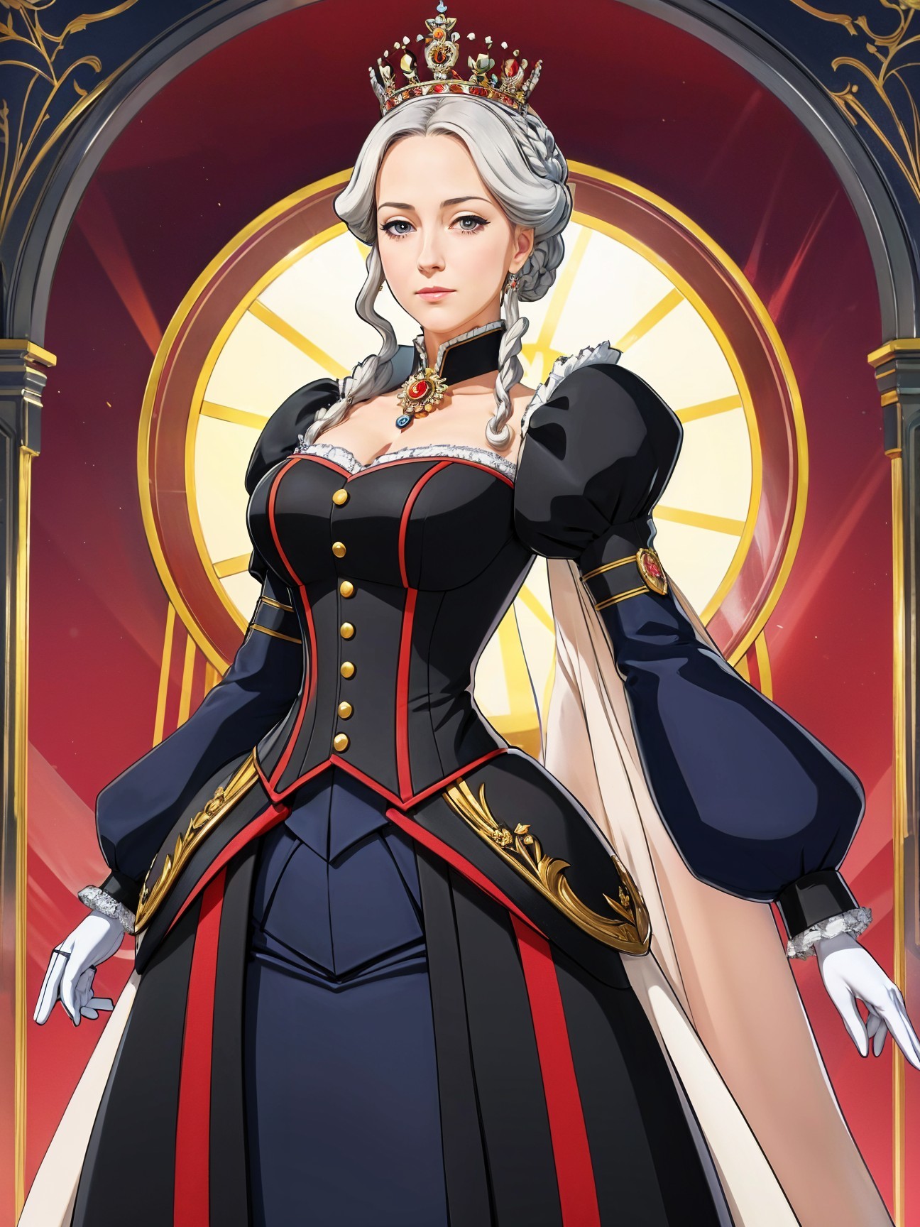 A beautiful anime woman with fair skin, light eyebrows, and light blue eyes looks forward with a neutral expression. She has light-coloured hair, some of it in two braids over her shoulders and some in a bun. On her head, she wears a gold and red crown with gems. Around her