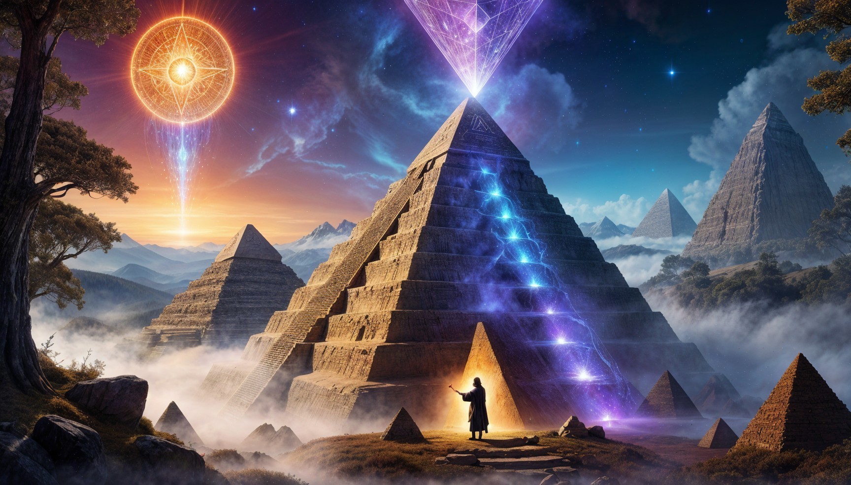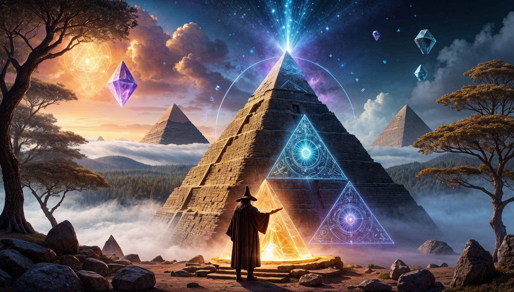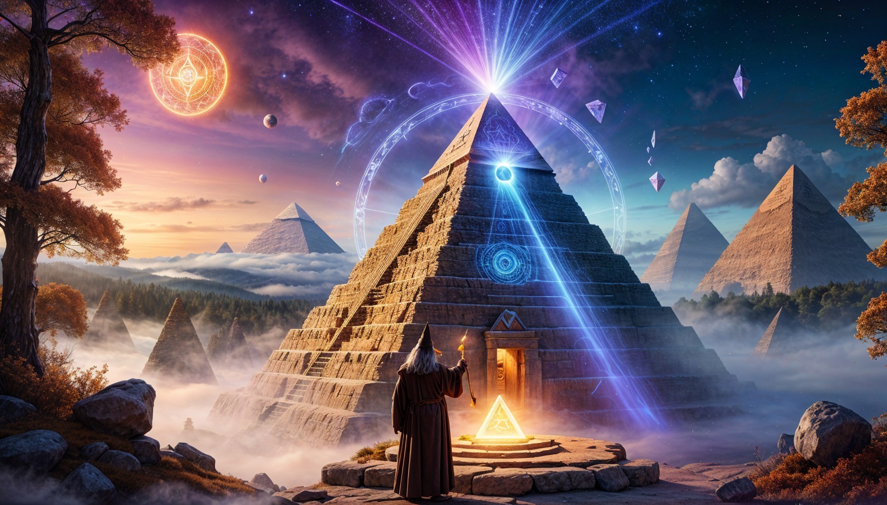 A mystical scene featuring a sorcerer standing before illuminated pyramids. Rising energy beams and celestial symbols illuminate a foggy landscape, blending ancient and otherworldly elements.