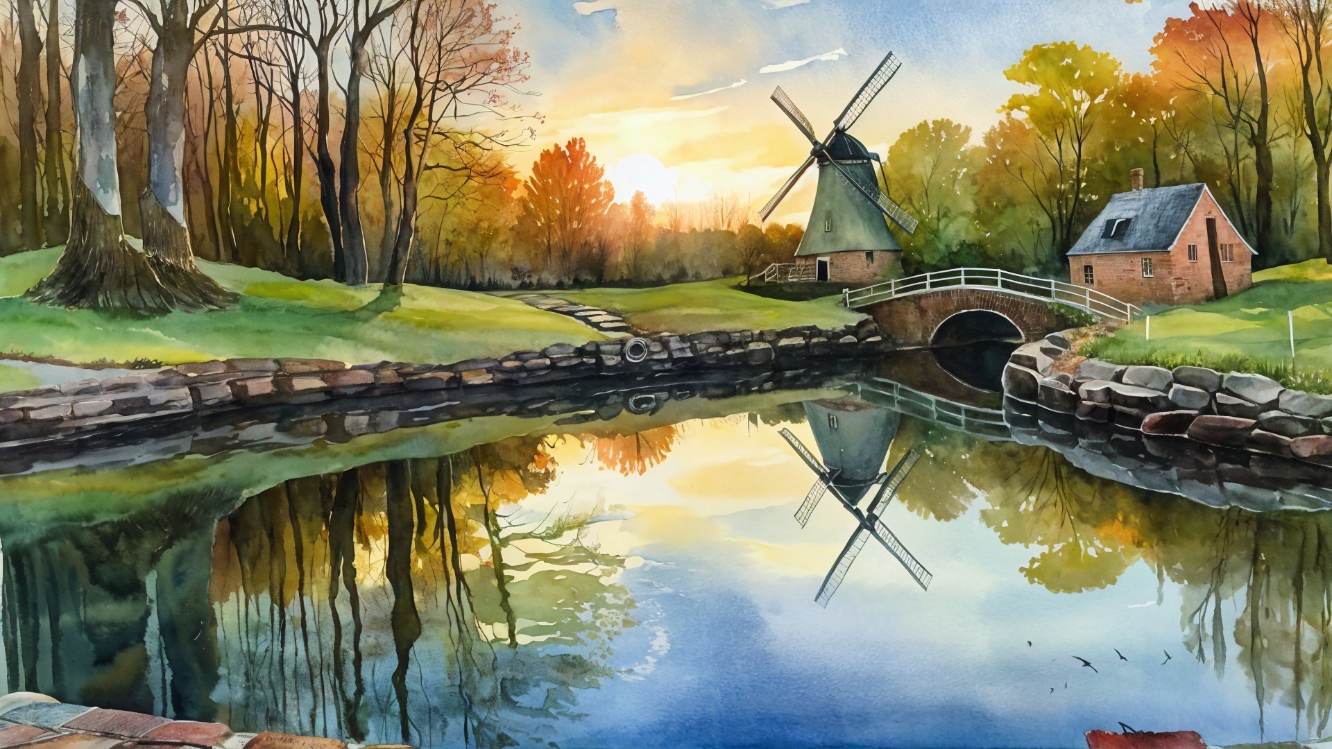 Grateful thanks and credit to original artist/dreamer, for the prompt. A picturesque watercolour scene features a charming red-brick house and a windmill beside a tranquil river. Vibrant autumn trees and a colorful sunset create a serene, idyllic atmosphere.