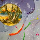 A vibrant abstract artwork features swirling colors of purple, orange, and blue, interspersed with circular patterns. A serene landscape scene with trees and a reflective lake is at its center.