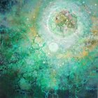 A serene figure adorned in a flowing white dress stands amidst soft, blooming flowers. A radiant halo glows behind her, illuminating the tranquil blue-green background, embodying ethereal beauty.