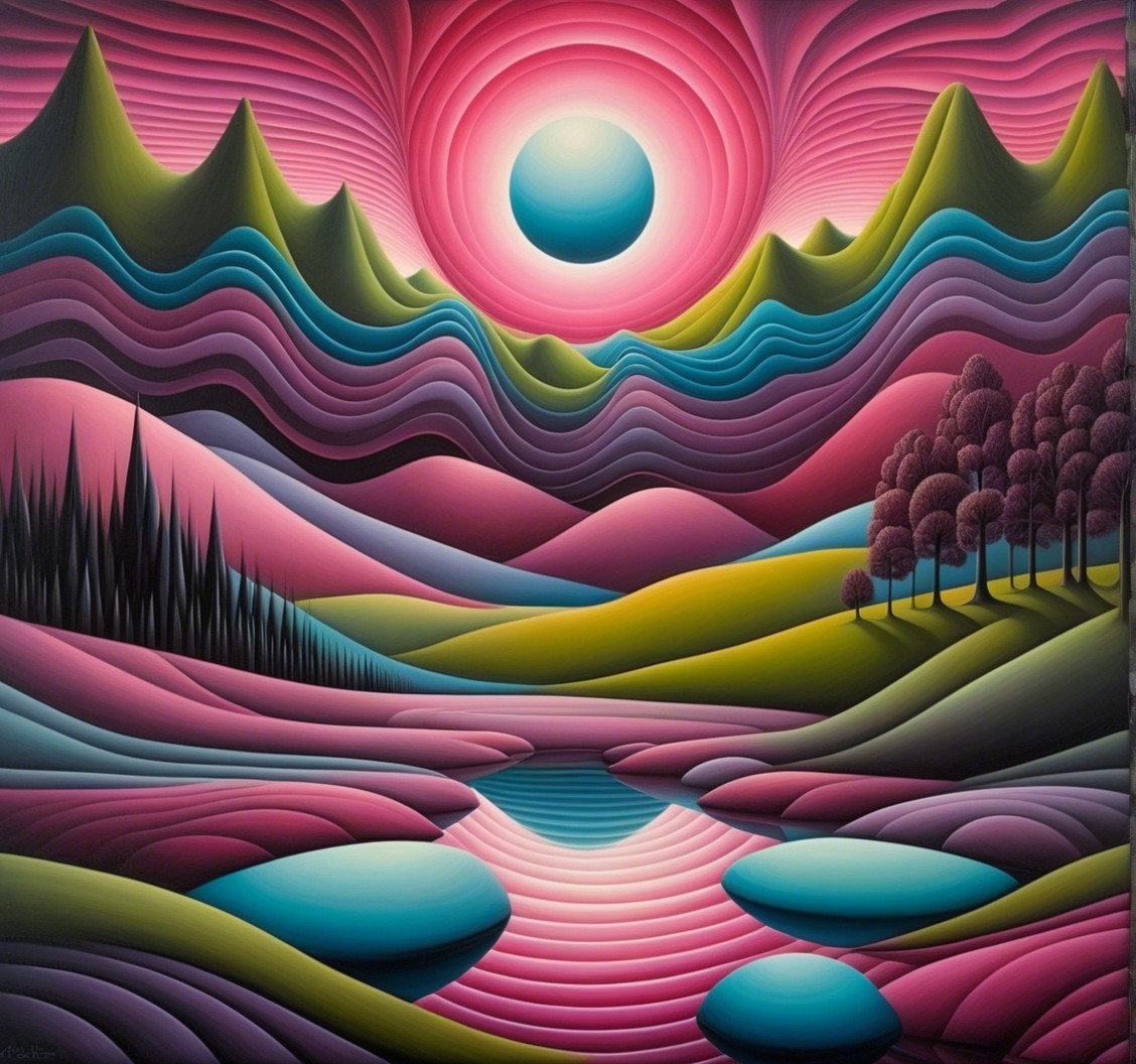 A vibrant, surreal landscape featuring curved mountains in shades of pink, green, and purple. A glowing sun hangs above a serene lake, reflecting the colorful peaks and dense evergreen trees.