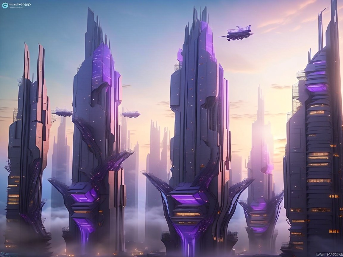 A futuristic landscape featuring towering spires with neon accents rising above a sea of clouds, bathed in a warm sunrise glow, while sleek aircraft soar through the sky.