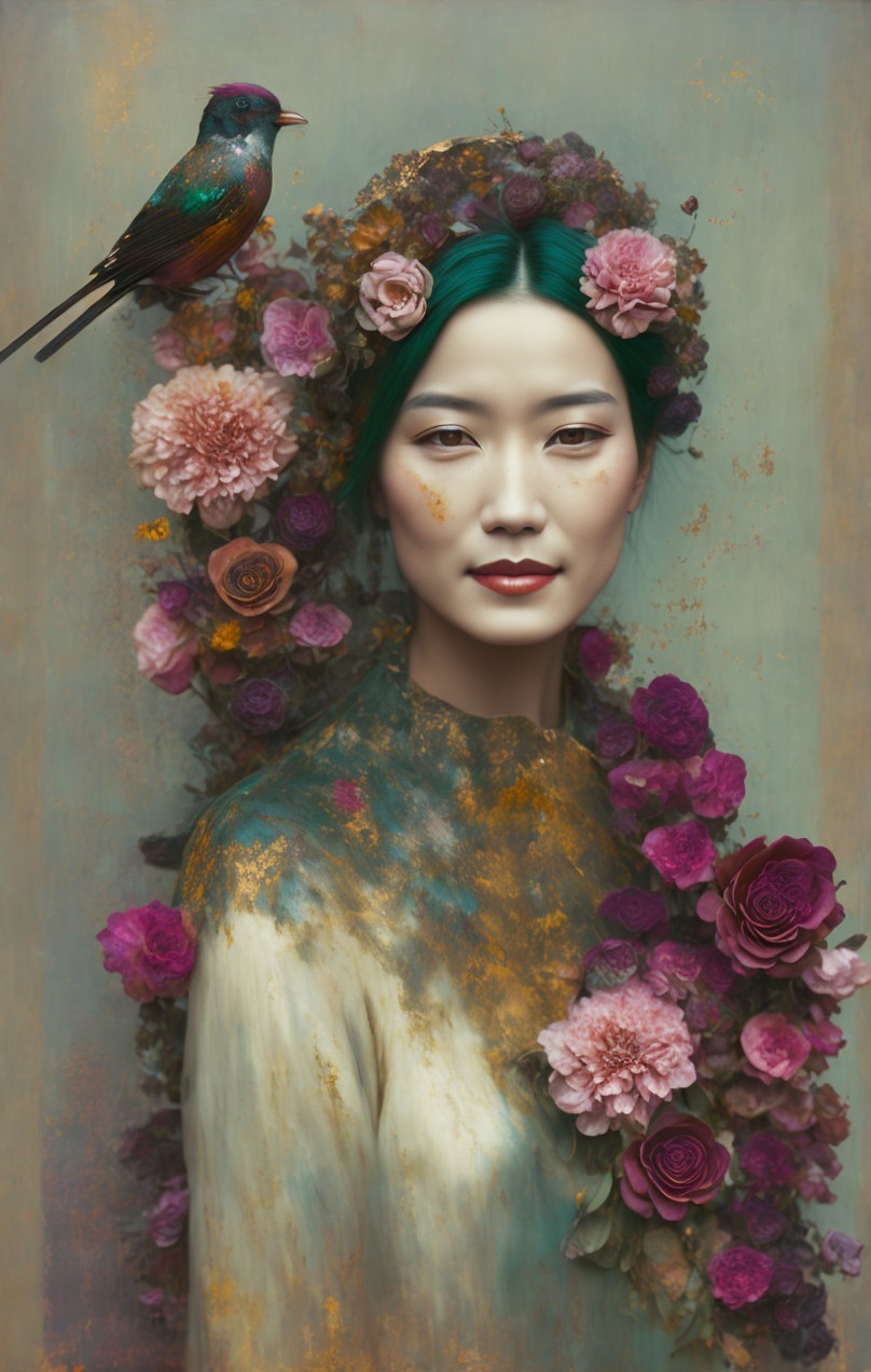 A woman with Victorian-inspired attire and hat, adorned with a flower, exuding a classical elegance.
