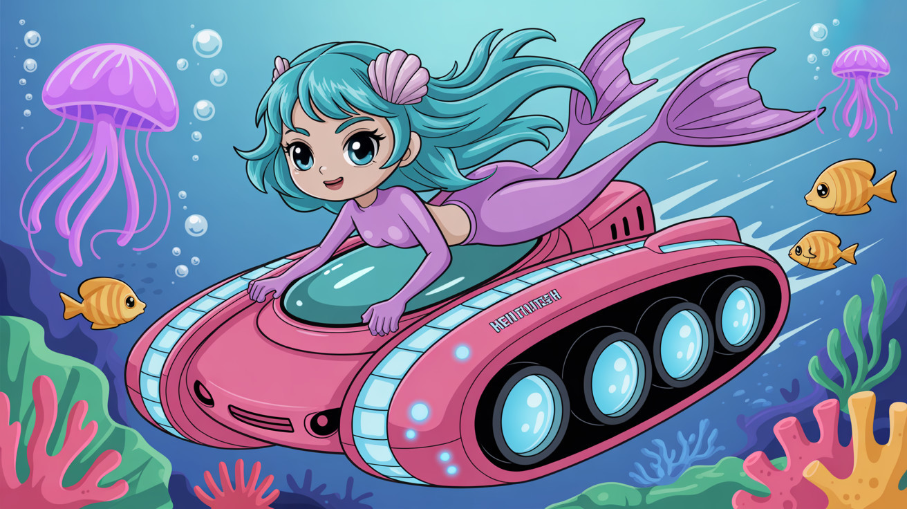 A whimsical scene unfolds as a charming anime mermaid, with vibrant scales and flowing hair, confidently maneuvers a tank through an underwater landscape, blending fantasy with unexpected adventure.
