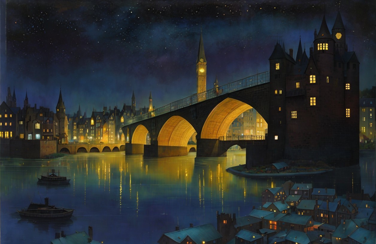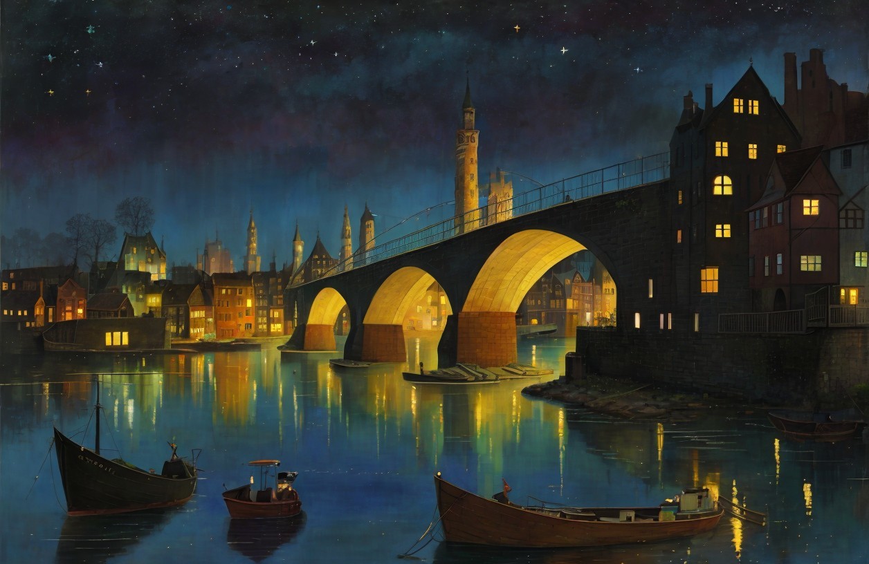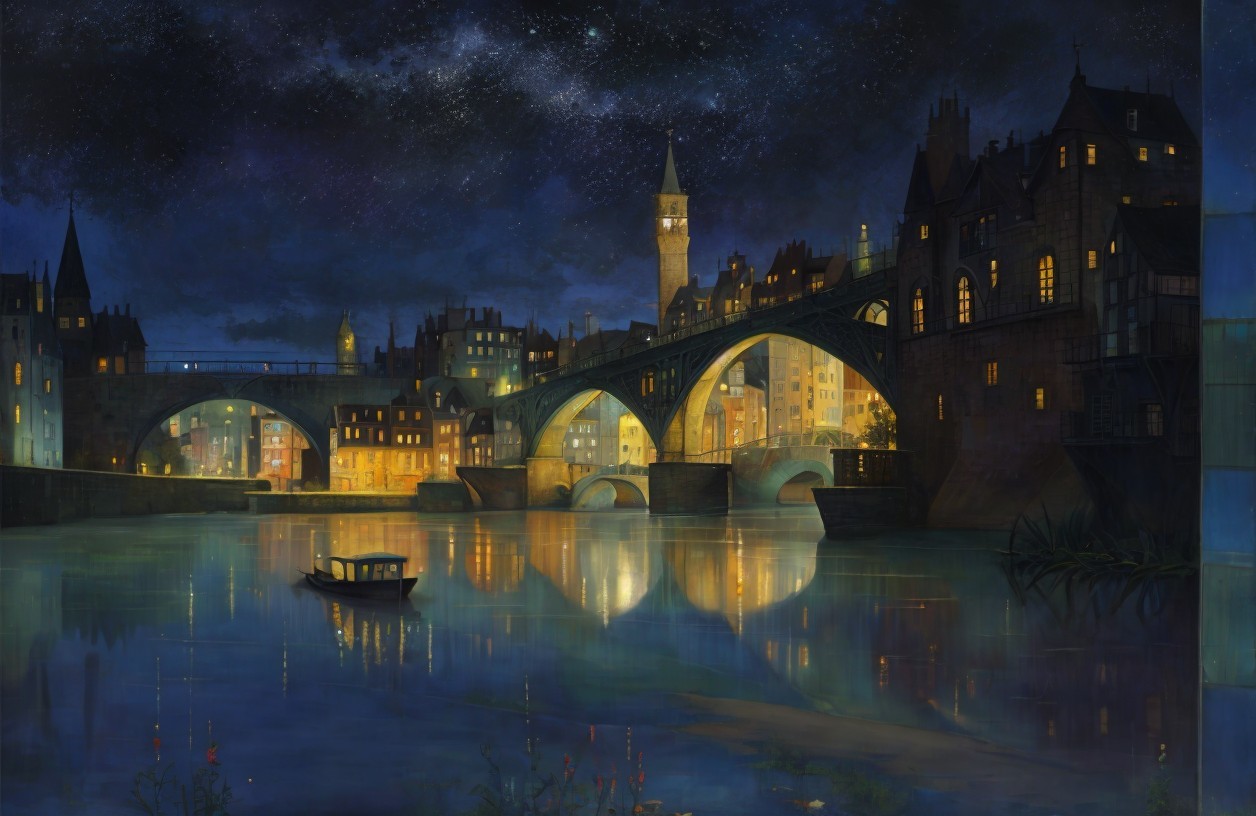 A beautiful arched bridge spans the lake separating two sides of the city.