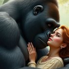 A woman gently touches her face to the side of a gorilla's head, showcasing a moment of connection in a lush, green environment. Their expressions convey curiosity and tenderness.