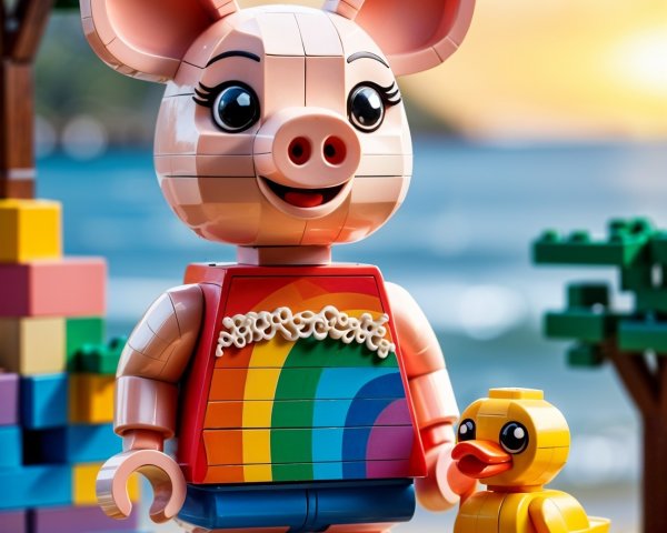 A surreal scene features a colorful, octopus-like creature with elephant features, wearing a vibrant dress, standing on a beach beside a rubber duck, against a dreamy sunset and ocean backdrop.