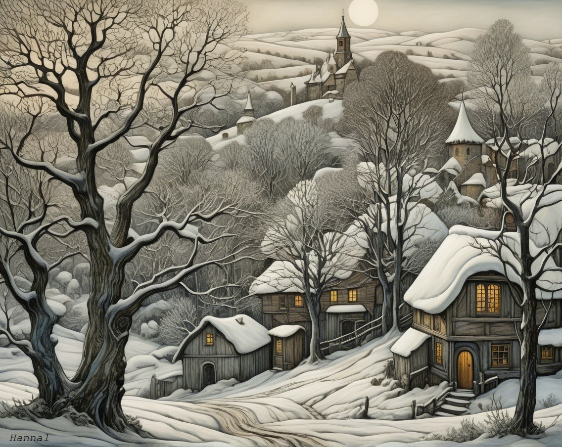 A serene winter landscape features a quaint village blanketed in snow, with cozy cottages glowing warmly. Towering trees and distant hills add to the tranquil, moonlit charm.