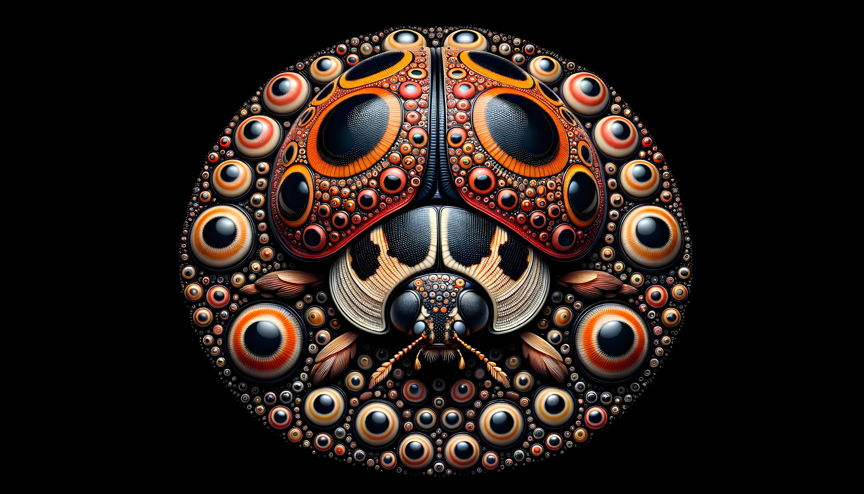 A hyperrealistic ladybug is depicted against a black backdrop, showcasing a vibrant, glossy exoskeleton with intricate patterns. The predominantly orange elytra feature circular motifs resembling ornate eyes, accentuated by black and white rings. The detailed head displays black coloration with white patches and compound eyes. Surrounding elements mimic ladybug features in soft