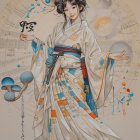A serene figure in an elegant, flowing kimono adorned with floral patterns. Holding a fan, she exudes grace against a backdrop of softly glowing lanterns and delicate clock designs.