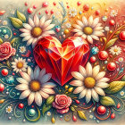 A vibrant, heart-shaped gem surrounded by colorful flowers, including daisies and roses, is embellished with decorative swirls and shiny elements, creating a joyful and romantic scene.