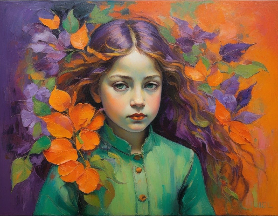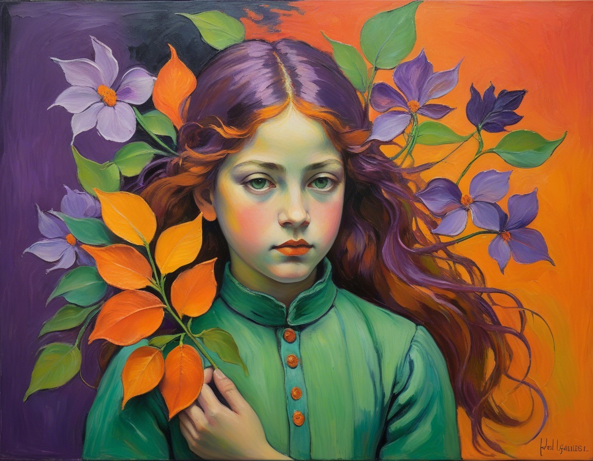 A striking portrait of a young woman with a braided hairstyle, set against a vibrant, geometric background of bold colors. Her expression is contemplative, highlighted by the harmonious patterns.