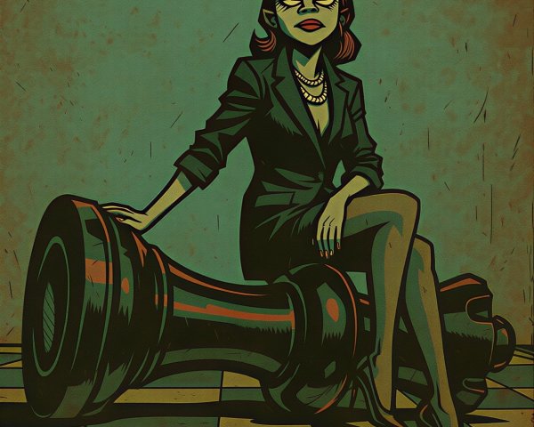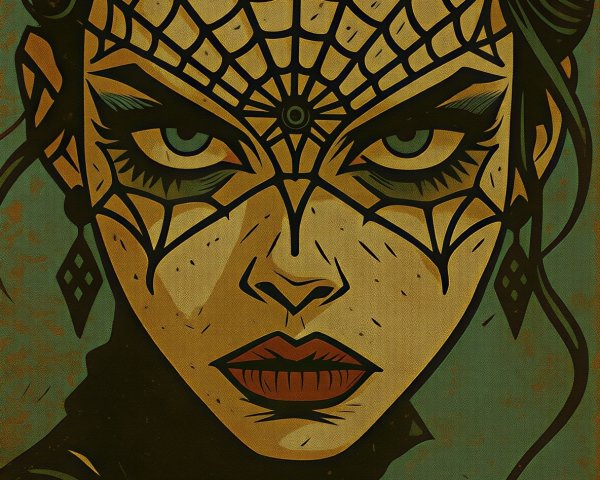 A powerful and stylized close-up portrait featuring a woman with an intense gaze. Her face is dramatically adorned with a spiderweb pattern that acts as a mask, dominating the upper half of her face and eyes. The art style has a retro, possibly comic book or distressed pop-art feel, utilizing a muted, earthy color palette of greens, blacks, tans, and deep reds. The overall mood is mysterious, dark, and fiercely captivating.