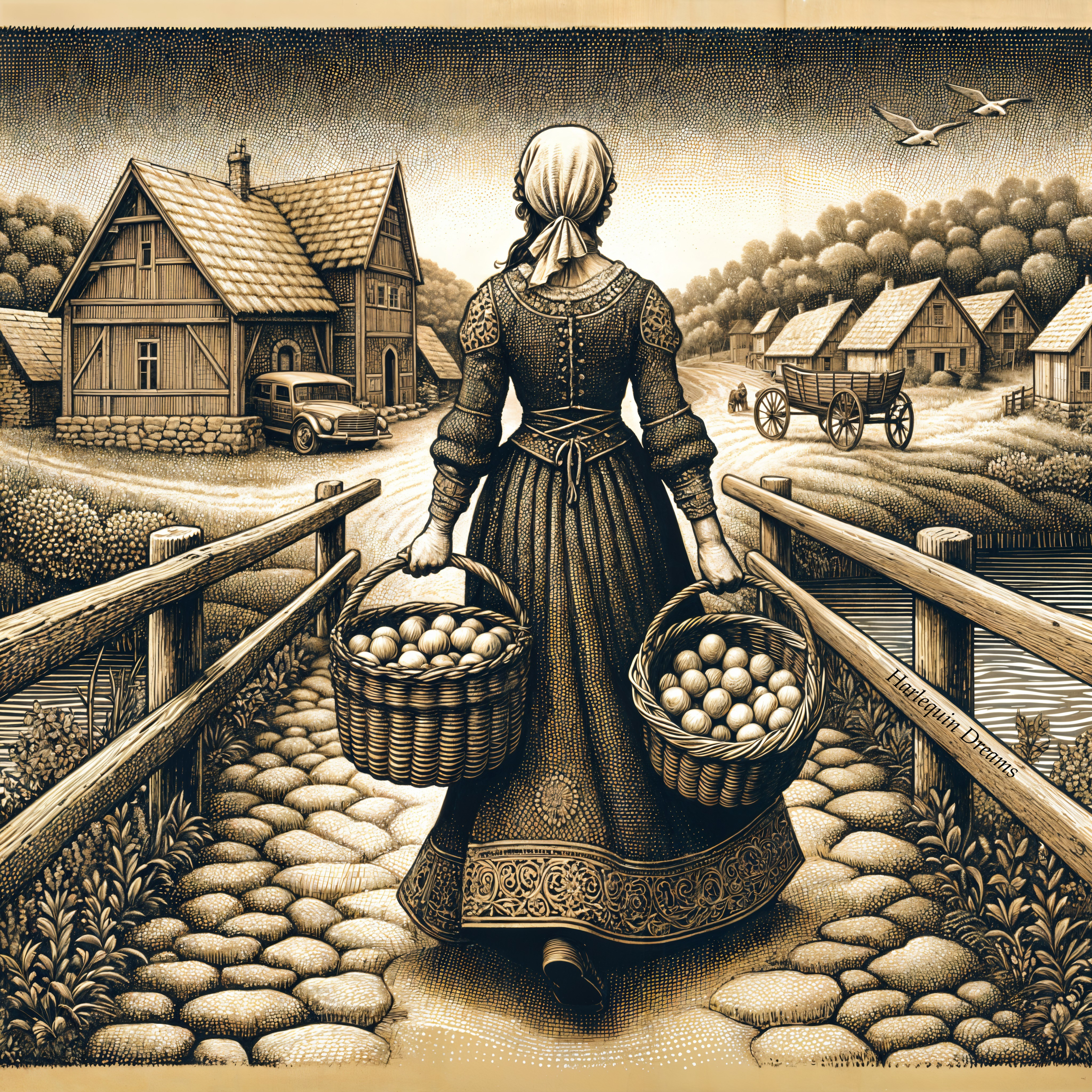 A woman in traditional attire carries baskets of eggs across a bridge in a rustic village with houses, a car, and a bird flying overhead.