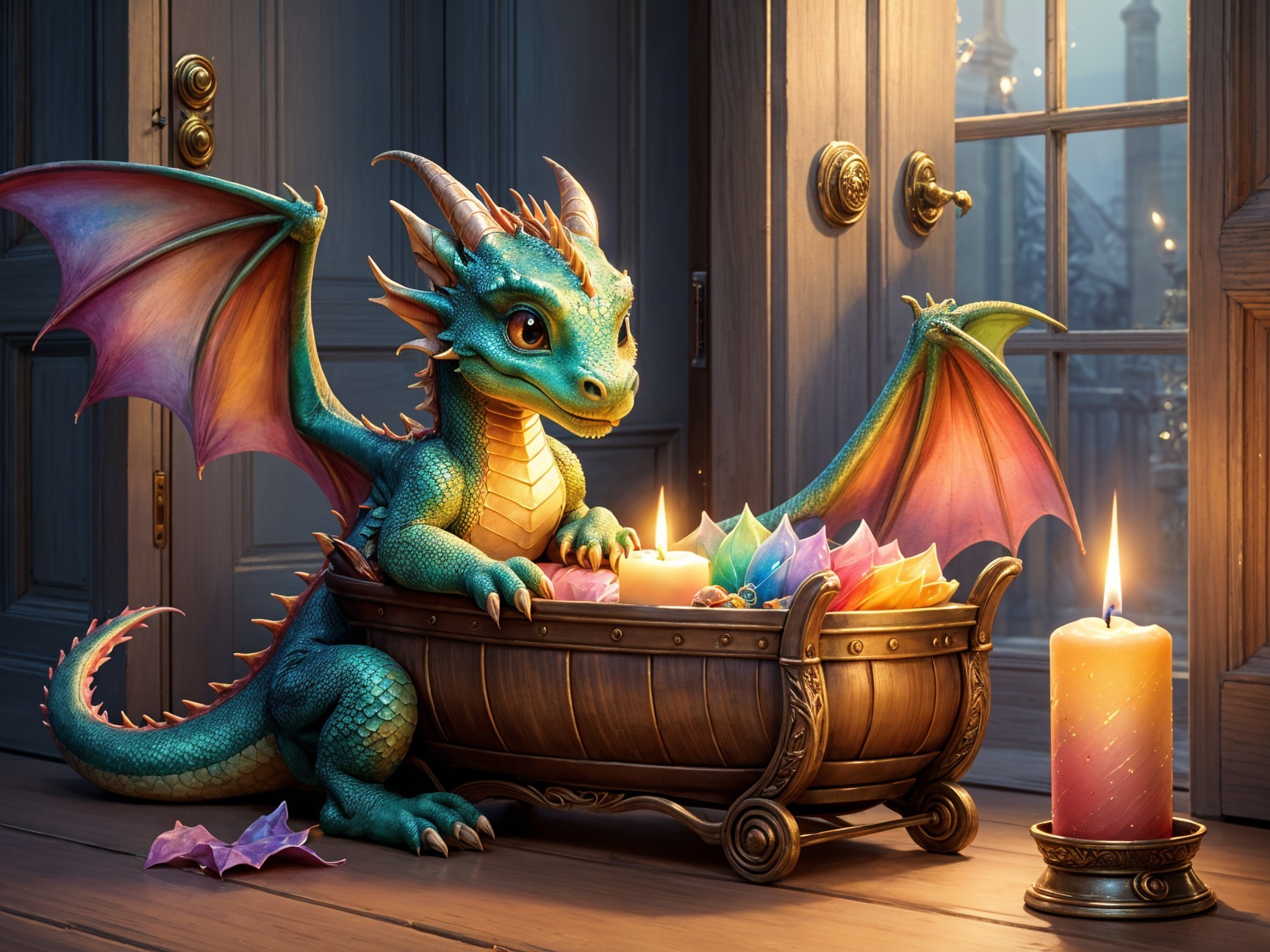 Prompt: Fill the cradle with gemstones. A baby dragon lies in a cradle. A female dragon walks on tip-toes out of the door. She holds a candle in one paw, the other paw is raised in a silencing gesture to her mouth.
