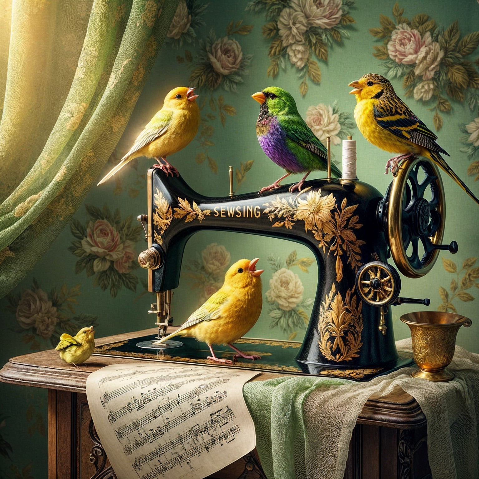 A colorful scene features four birds perched on a vintage sewing machine adorned with floral patterns, set against a green wallpaper background, with spools of thread scattered around.