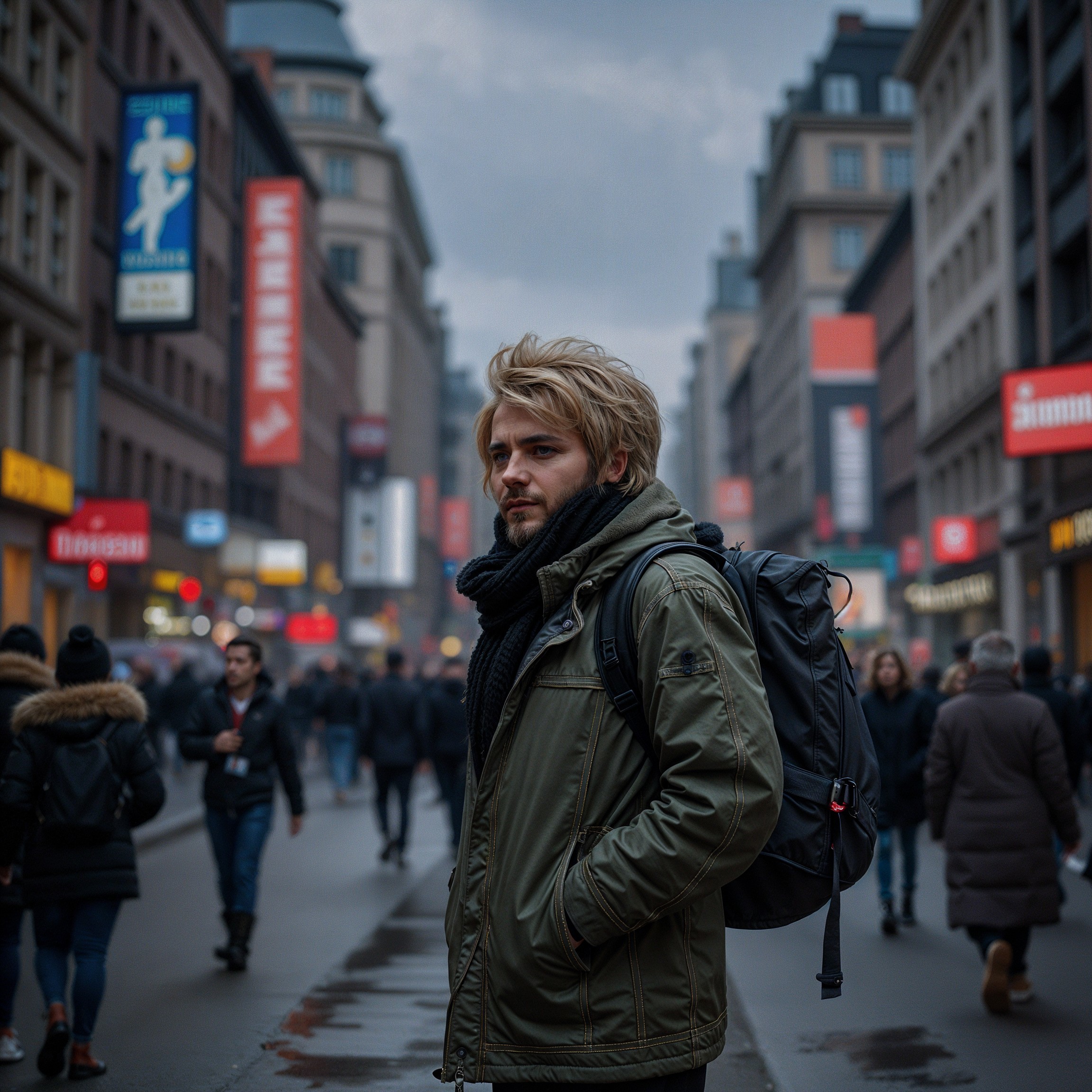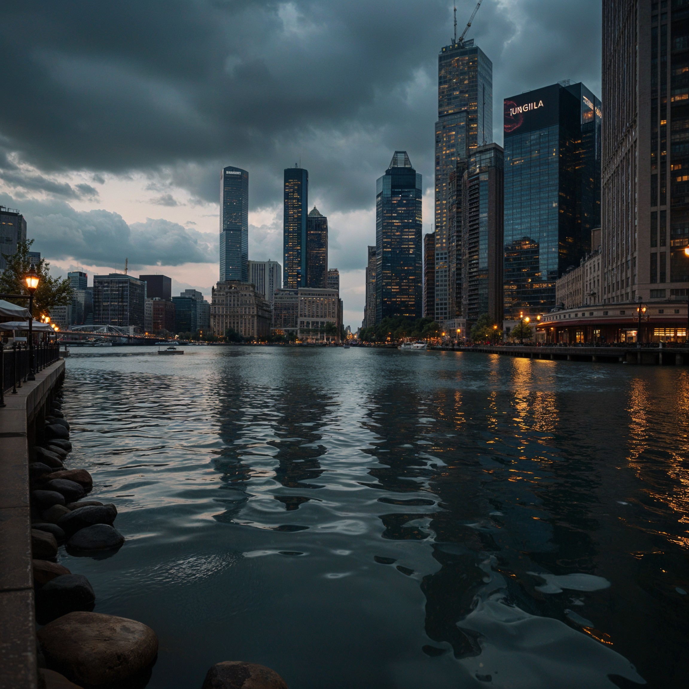 A city skyline reflects on a calm river at dusk, with towering skyscrapers and vibrant lights. The scene is framed by clouds, creating a serene yet dynamic urban atmosphere.