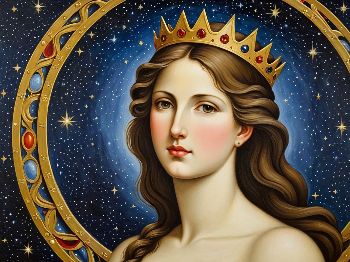 The image features a regal woman with flowing brown hair, adorned with a golden crown set with red jewels. She is surrounded by a starry night sky, symbolizing the Virgo zodiac sign.