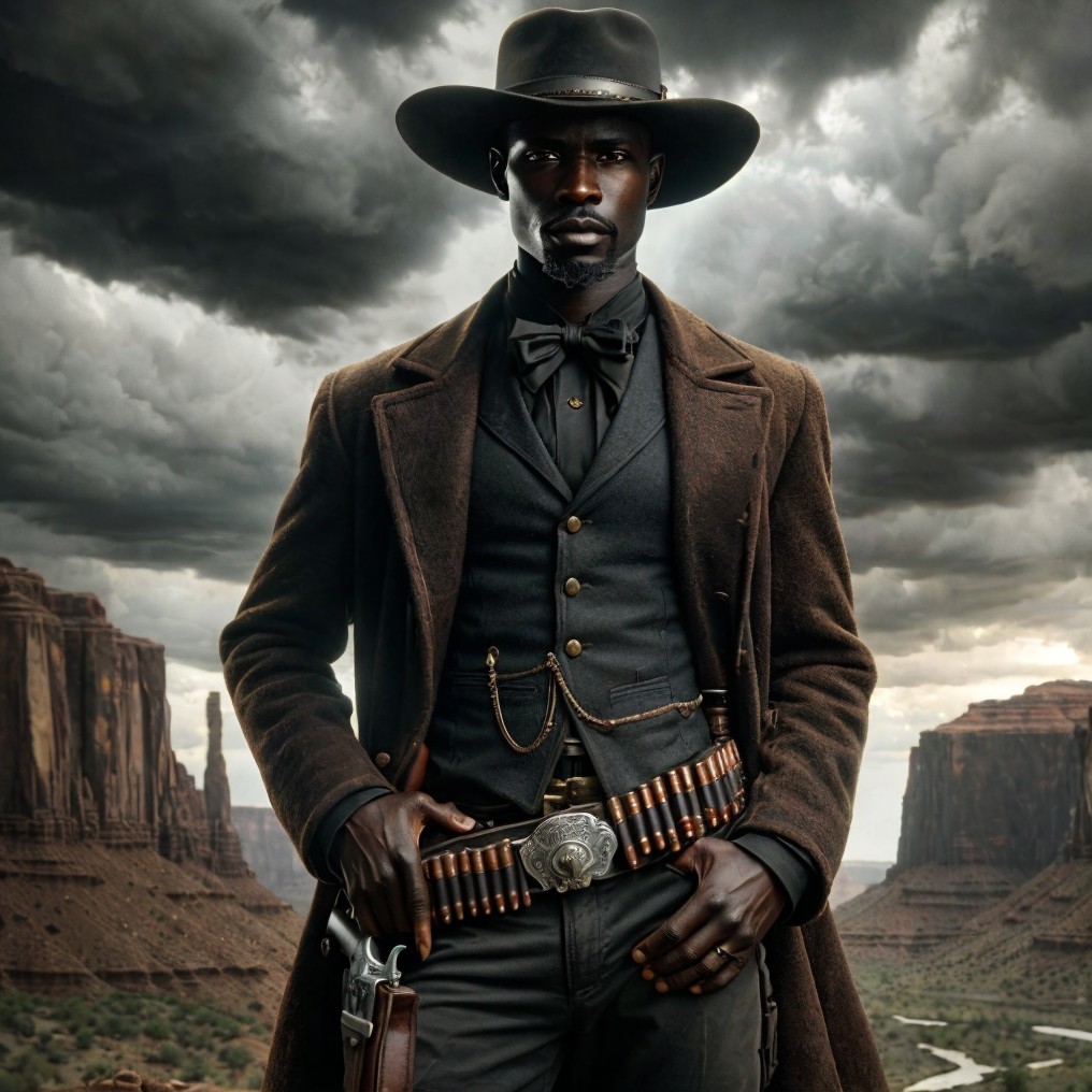 A stern man in a cowboy hat and western attire stands before a cloudy desert backdrop, a gun holstered at his side.