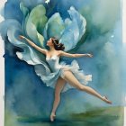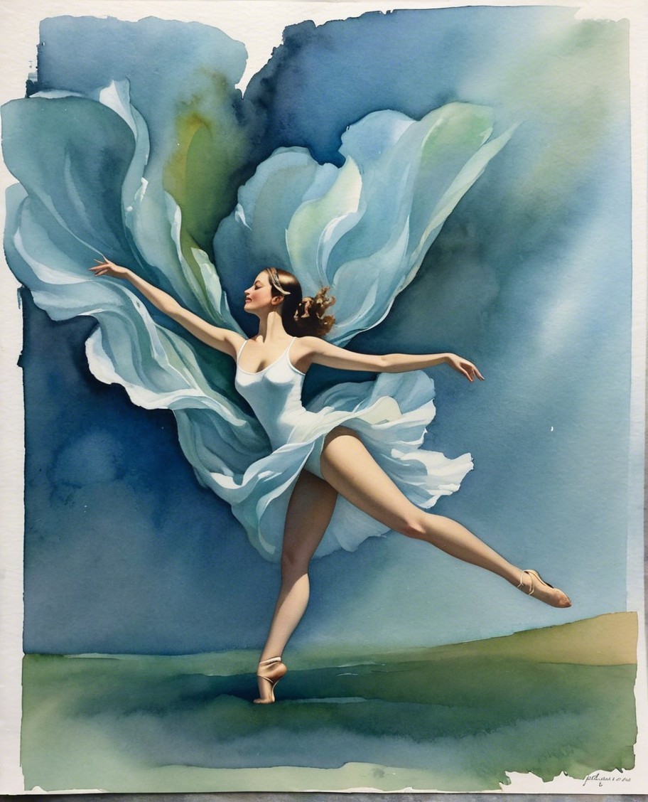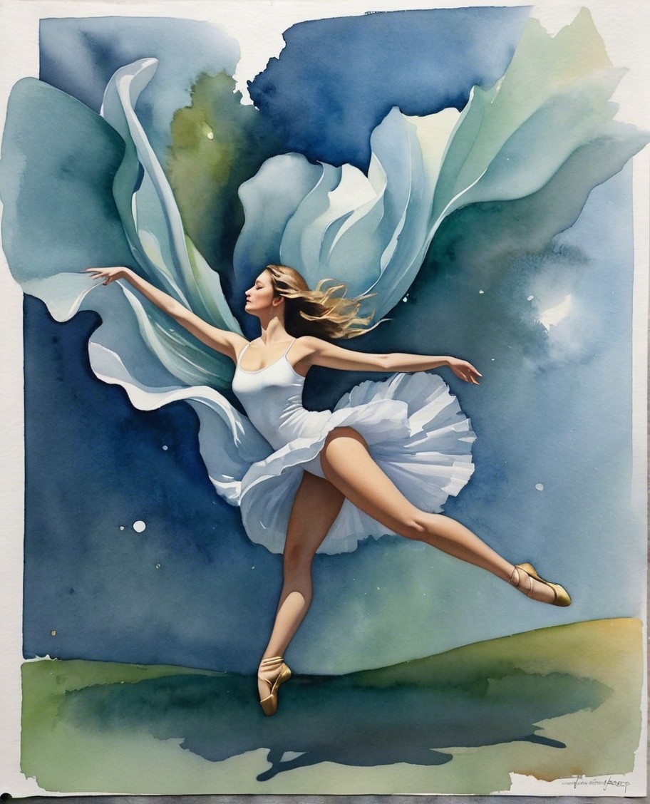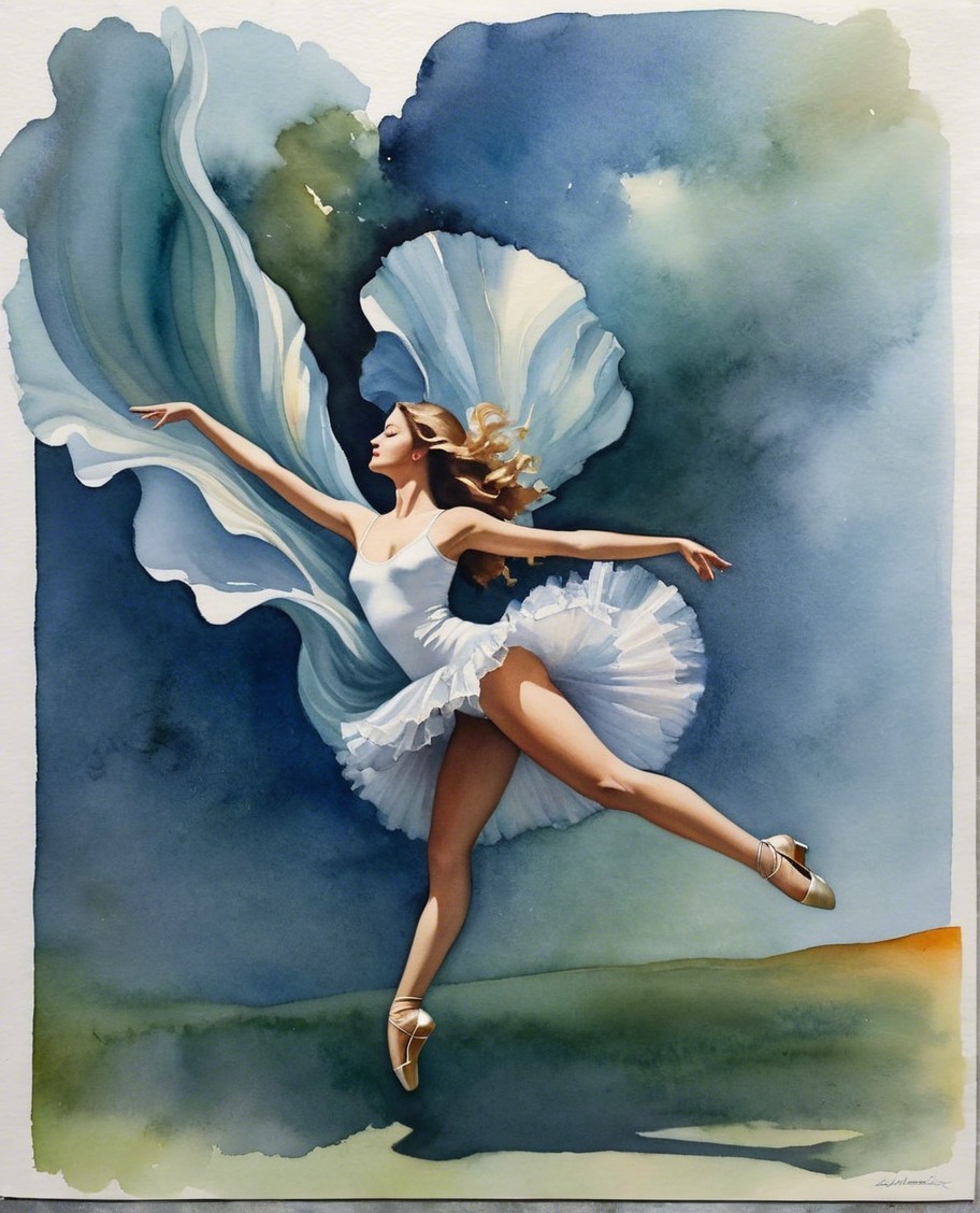 A graceful ballerina dances elegantly, wearing a white tutu and pointing shoes. Flowing white fabric billows around her against a dreamy watercolor background. The scene captures motion and beauty.