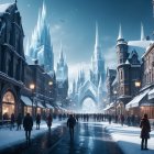 A snowy street scene features vibrant, colorful buildings under a starry night sky. Silhouetted figures walk past shop windows, with towering church spires illuminating the enchanting atmosphere. Soulless Zombies Waiting for Black Friday to Arrive, only on that day will they live or feel fullfilled, before they eventually fall back into the dead eyed trance of ever hungry consumeroids.