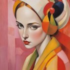 A striking portrait features a young woman with bold colors in her hair and clothing, showcasing a geometric style. Her expressive eyes and soft features create an intriguing, modern feel.