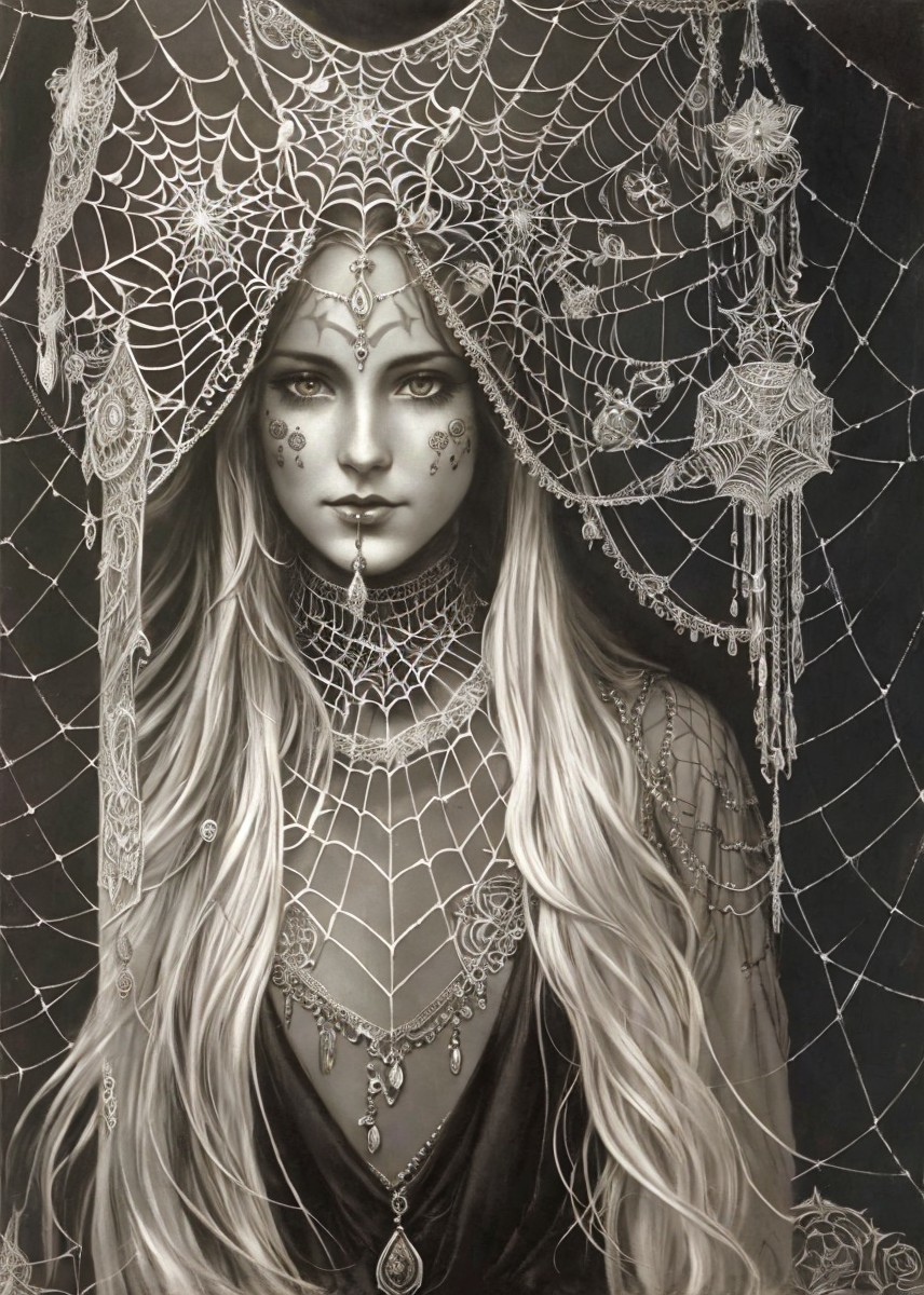 A striking figure with long, flowing white hair, adorned in a dark gown. Intricate cobwebs and shimmering accessories create a hauntingly elegant atmosphere, blending beauty with a gothic aura.