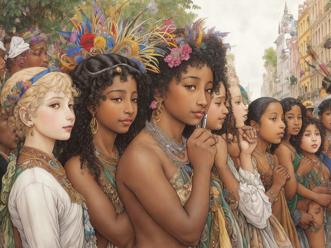 The image features a diverse group of women standing side by side, adorned in colorful accessories and elaborate hairstyles, set against a backdrop of an urban street scene.