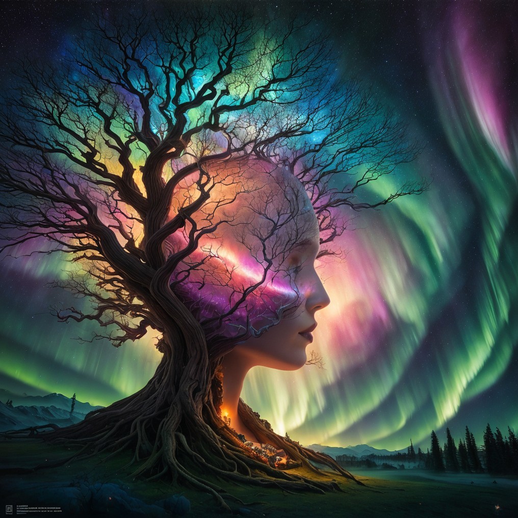 A vibrant artwork blending a tree's silhouette with a woman's profile against a backdrop of colorful auroras and a starry night sky.