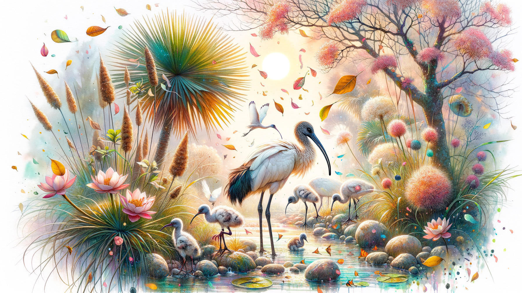 A captivating scene showcases African sacred ibis and their chicks among lush Cyperus papyrus.