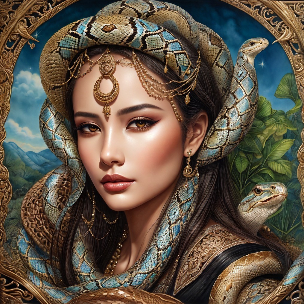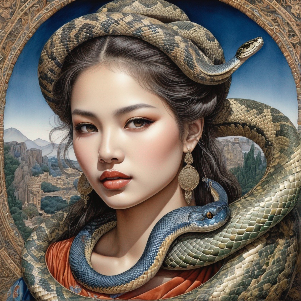 An illustrated woman with a snake and ornate jug, in a stylized, mythical setting with intricate patterns and architecture.