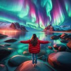 A person in a red jacket stands in snow, gazing at a breathtaking display of the Aurora Borealis. Vibrant green and purple lights dance above majestic mountains and a serene lake at sunset.