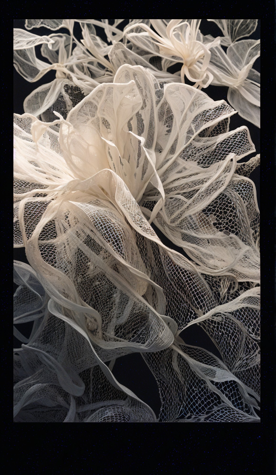 Dans un vide noir infini, une cascade de dentelle ivoire semble figée dans sa chute. Un éclairage latéral puissant sculpte la forme par la technique du clair-obscur , créant un contraste dramatique entre des plis profonds, noyés d'ombre, et des arêtes vivement illuminées. Le mouvement du drapé, avec ses volutes amples et ses froissements serrés, suggère une matière à la fois lourde et aérienne, soumise à une gravité simulée.