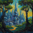 A vibrant landscape features a fantastical city with striking crystalline towers, framed by lush, swirling trees under a bright, colorful sky. The scene captures a dreamlike, mystical atmosphere.